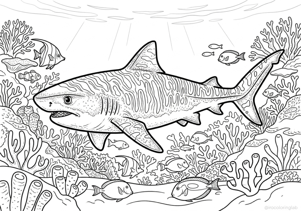 Known for its unique tiger-like stripes, the Tiger Shark is one of the most powerful and fascinating hunters in the sea. Dive into the deep blue and give this magnificent shark some cool colors.